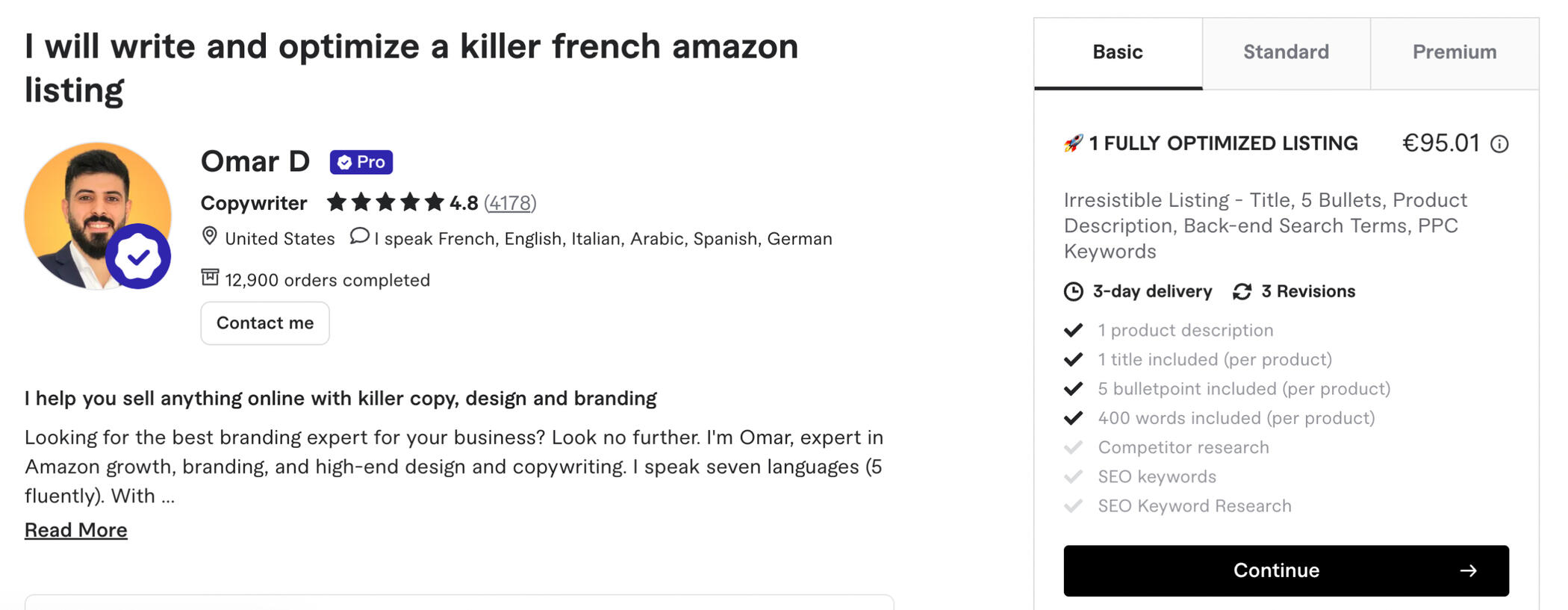 Il y a 4 millions d'entreprises rien qu'en France et pour la plupart d'entre elles avoir une présence web est indispensable. Vous apprendrez à identifier leurs besoins en service web (par exemple : campagnes d'email marketing, rédaction de fiches produits et de services, création de tunnels de vente).Si ces termes ne vous parlent pas ("email marketing", "tunnel de vente", "rédaction de fiches produits"), rassurez-vous, il n'y a pas besoin d'être de connaitre ces domaines ou d'avoir de l'expérience.Bonne nouvelle, même en ne connaissant pas ces domaines, on peut demander à l'IA de réaliser ces services.Je vous le montre comment le faire, en proposant d'excellentes prestations, au même niveau que vos concurrents qui vendent ausi des services web (mais qui eux le font manuellement sans IA, à l'ancienne).Voici l'exemple d'une personne qui vend une fiche produit Amazon pour 95€. Cette personne a 4178 avis.